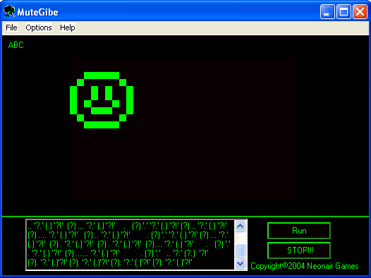 "MuteGibe is a programming language I made that consists entirely of punctuation(only . ? ! ( ) ' "). It can display text and numbers, play 3 different beep sounds, use loops and "if statements, display one color graphics, and receive input from the keyboard(enter and arrow keys only though)."