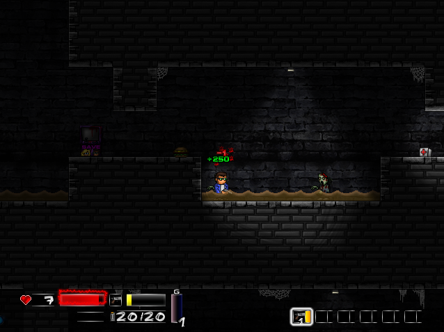 This game is hard - even on the lowest difficulty setting. But it's still a hell of a lot of fun. Killing off zombies with your pistol and shotgun is extremely satisfying, and the platform elements of the game have been implemented well. One place that this game shines is certainly the upgrade system. You can upgrade your weapons by collecting little "G" items, which are dropped by enemies once they're downed. You can also upgrade your statistics and abilities by collecting orbs - it's a very detailed system which you'll need to use if you're to fight the zombie horde.