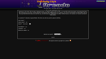 Ahem. Looking to submit something to the TDC Arcade, are you? We'll if so, you've come to the right place, and if not, then just keep on walking. Since some people have been asking about the arcade and whether 'tis done, I've gone ahead and prepared a submission form for arcade games! It's hosted on my own domain, so don't be afraid when it appears that you've left create-games.com. It'll only appear that way because that's exactly what you've done (gotta preserve that bandwidth, folks.)