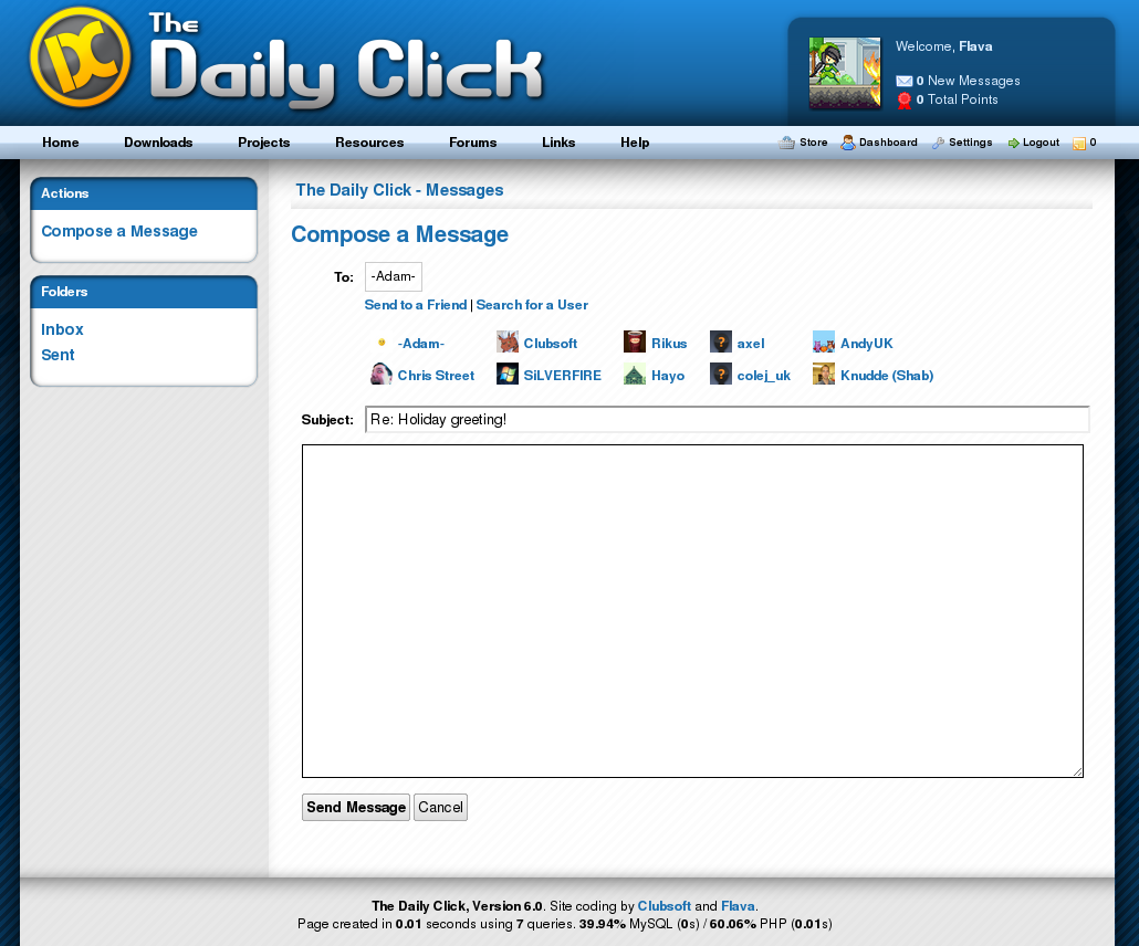 The next screen-shot shows the "Compose message" page. Again, the basic feature is the same except it is now much easier to find and send messages to users. You can select a user from your friends list, or search for a user (see screen-shots below) extremely quickly. All of this is done using background requests - so no loading new pages or opening pop-up windows!