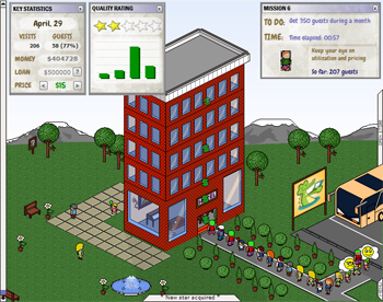 the building, add floors and rooms, decorate yard, hire and manage staff, build pools, establish services, adjust pricing and improve